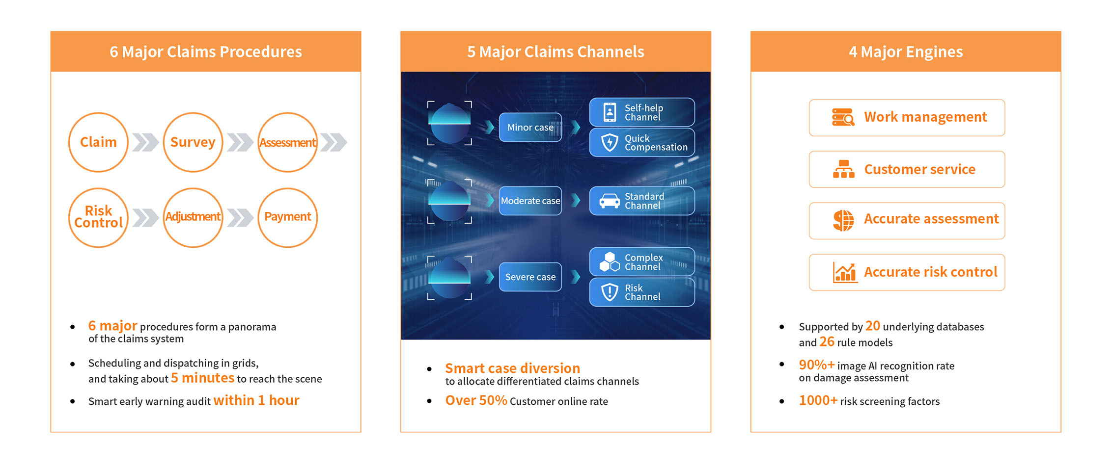 Six major procedures (filing, investigation, assessment, risk control, adjustment and payment), five major channels (self-service channel, quick compensation channel, standard channel, complex channel and risk channel) and four major engines (operation management engine, customer service engine, accurate damage assessment engine and accurate risk control engine) realize lower risks, better efficiency and services in claims.