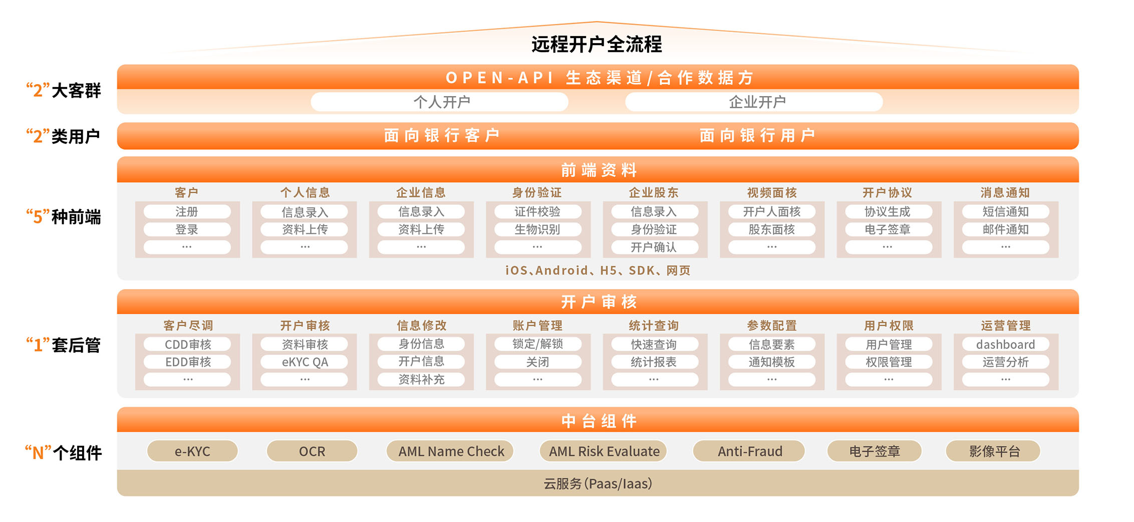 统一的开户管理平台,解决个人和企业开立银行账户的统一管理的平台需求,以客户为中心,把客户、存款/贷款账户、信用卡等等开立流程中的信息管理、客户识别、反洗钱、风险管理等入口进行统一管理,弹性配置,切实提升开户效率,降低开户成本。