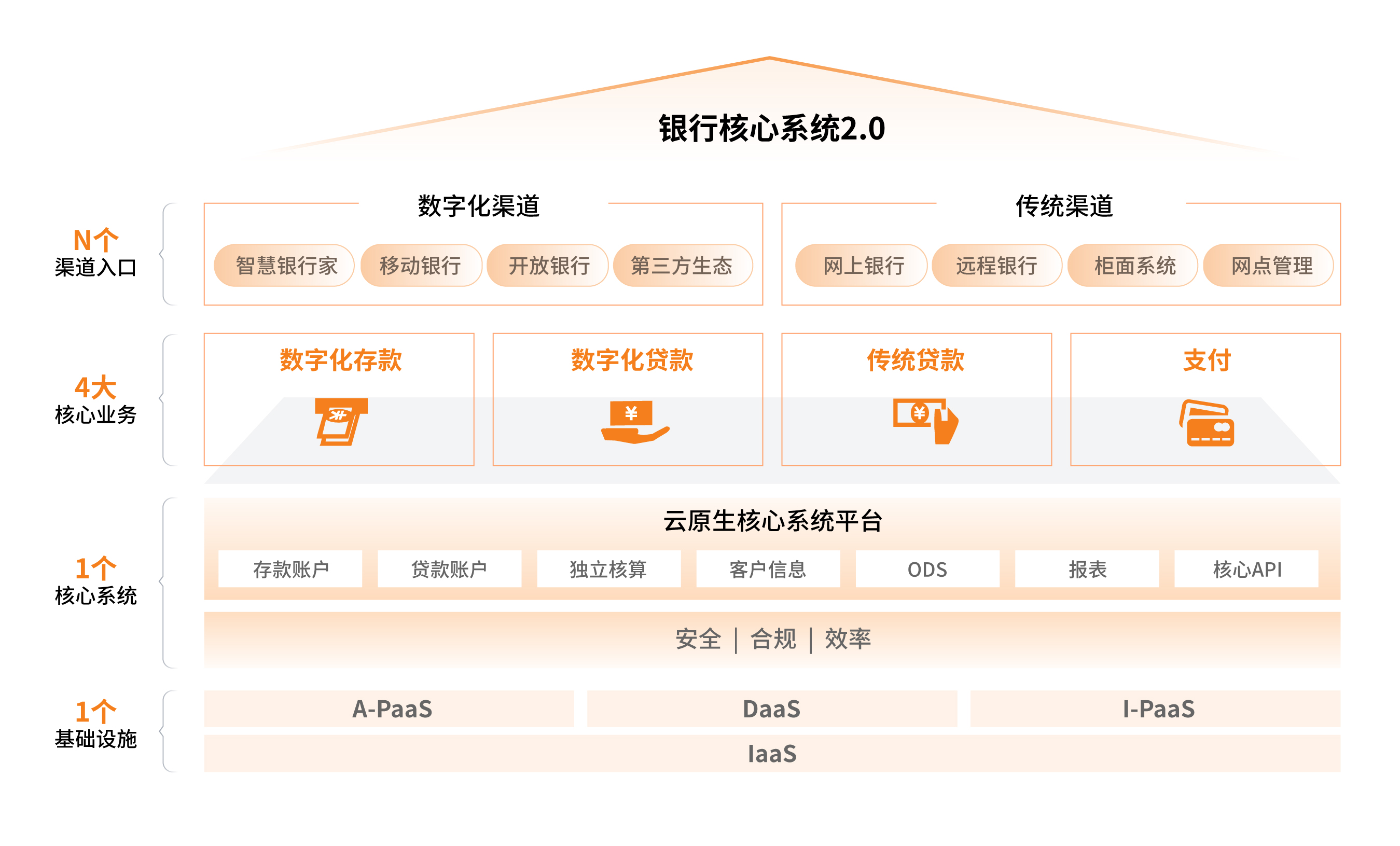 通过1个核心系统基础平台+4大业务领域提供一站式数字化转型服务,帮助银行从科技赋能、业务创新、客户体验和生态重塑四个层面释放全新价值。