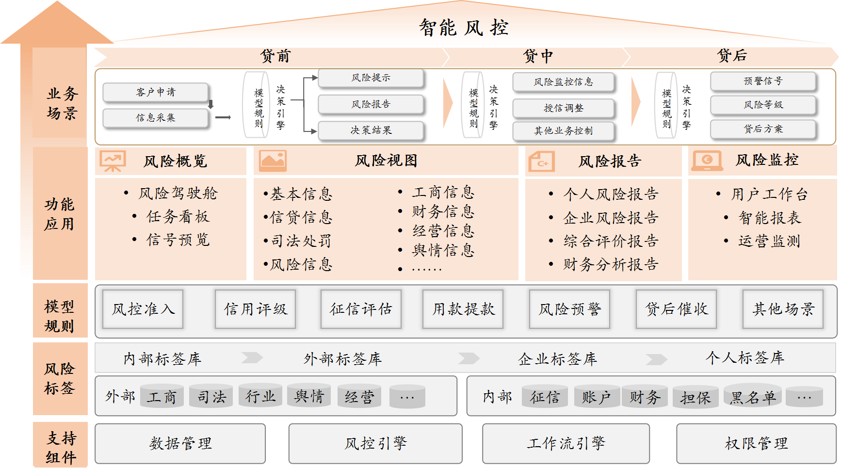 基于线上化、流程化、可视化的设计理念,将技术、数据、场景三者相结合,并融合模型、视图,实现线上自动化评估、智能审批、智能预警、智能催收、智能分析。
