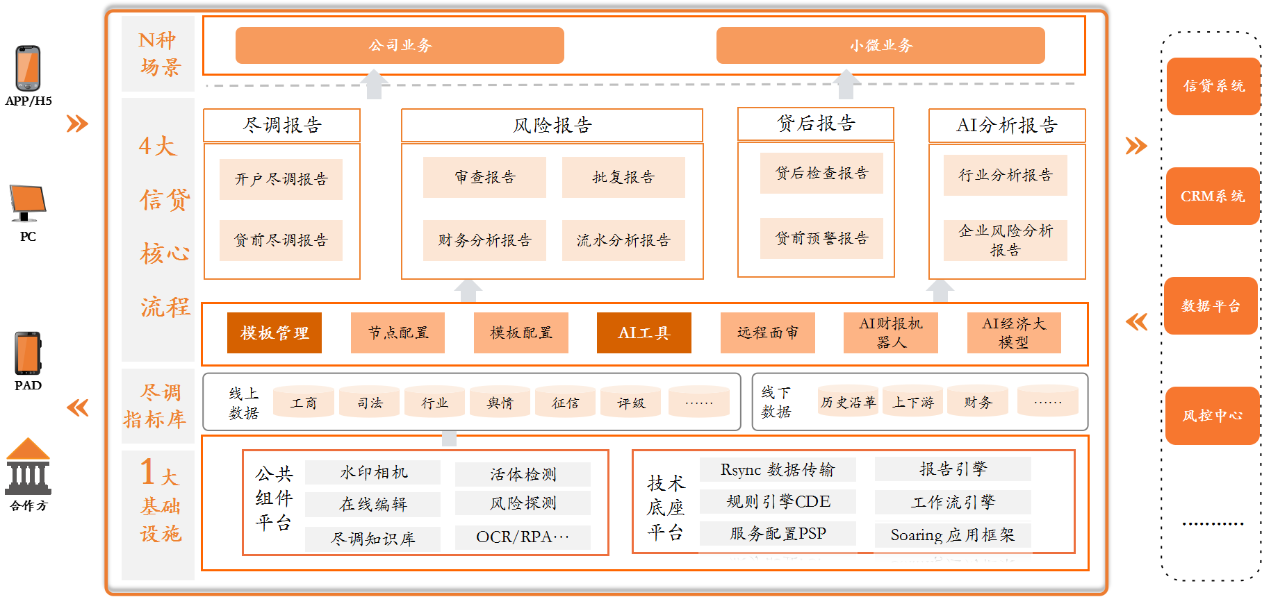 智能尽调业务架构:1大基础设施,支撑4大核心流程,满足N种核心场景
