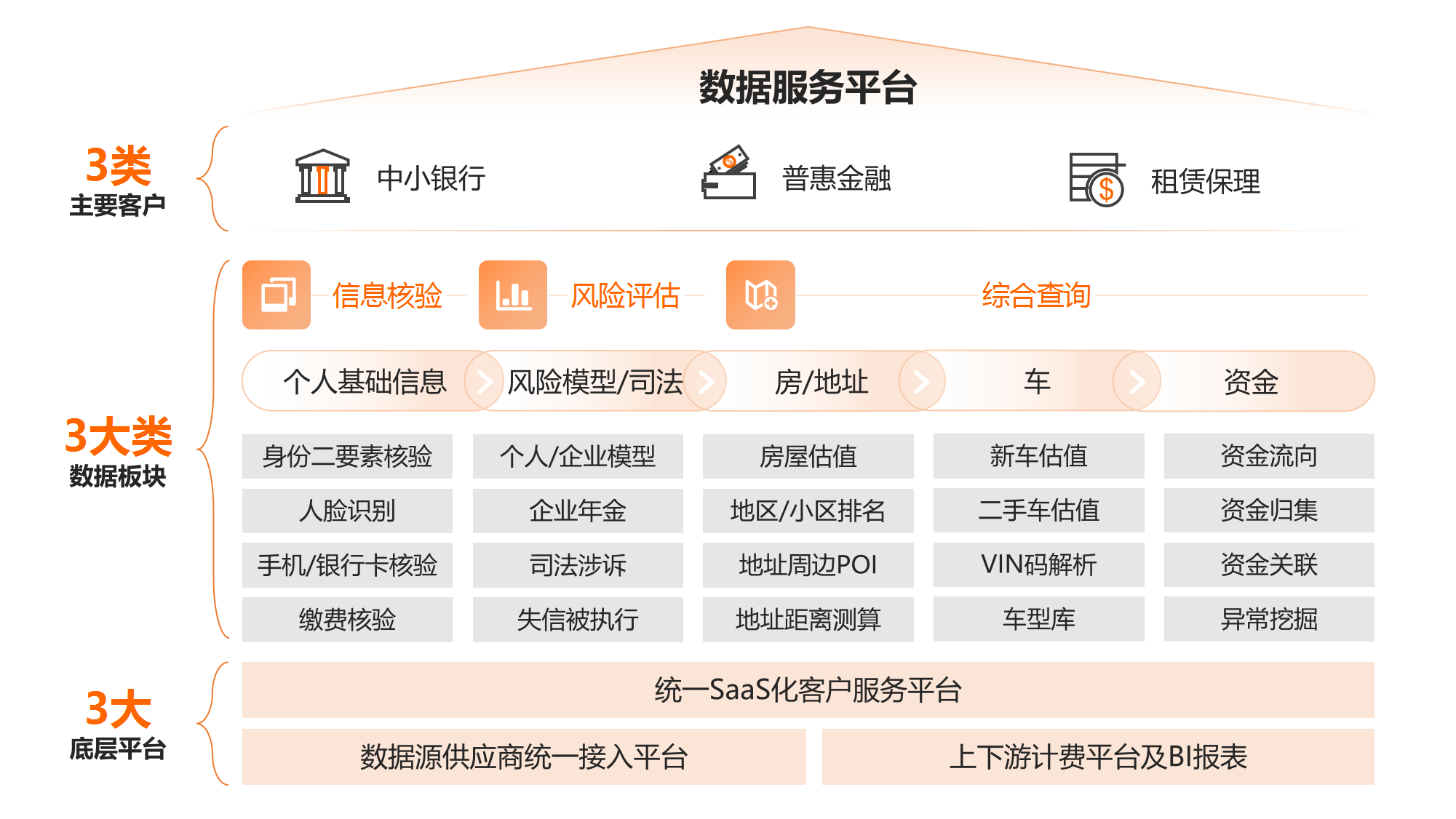 涵盖个人基础信息、司法、房屋、地址、车辆、资金等各类信息的核验,并拥有强大的底层统一接入及输出能力,广泛服务于中小银行、普惠金融、租赁保理等合作伙伴。