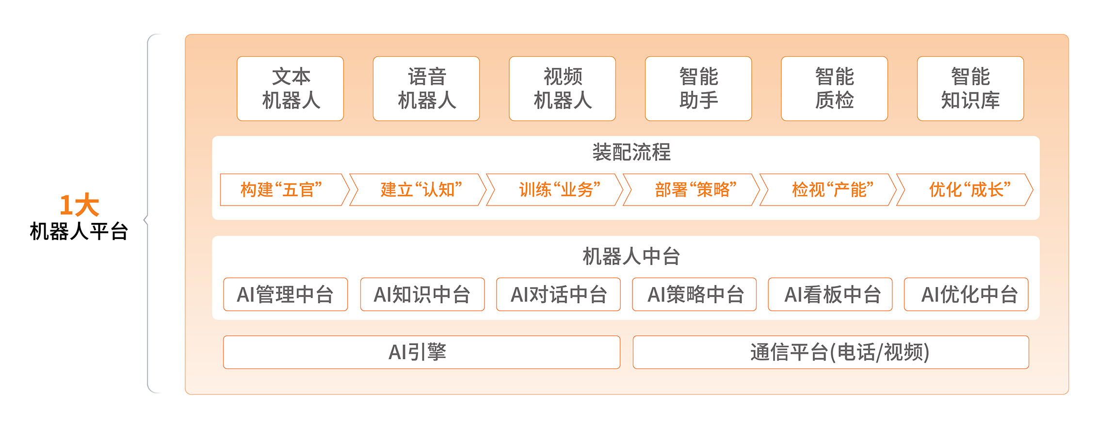 机器人平台,由6大标准化产品、6大机器人中台和核心引擎构成,助力企业AI赋能